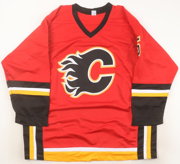 Custom on-ice style jersey with everything sewn on, size XL. Hand-signed by Mark Giordano. The autograph includes an official James Spence Authentication (JSA) hologram and QR Code card for authenticity...