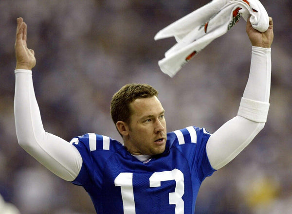 Custom on-field style Pro Cut Jersey. Everything sewn on, size XL. Hand-signed by Mike Vanderjagt. The autograph includes an official Beckett Authentication Services serially numbered hologram and QR Code Card...