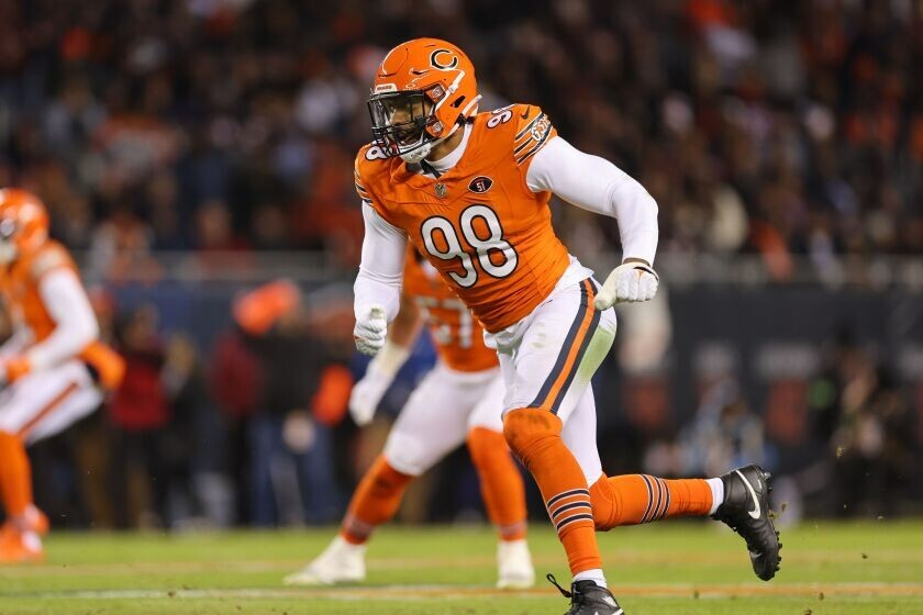 Chicago Bears White Panel Logo Football has been hand-signed by Montez Sweat.
