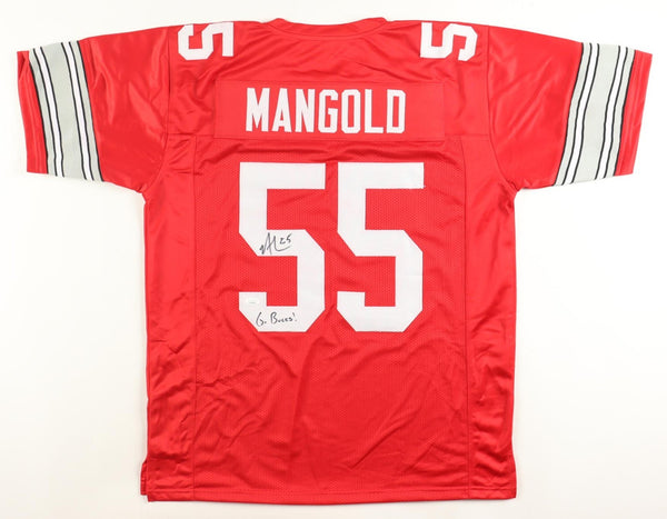 Custom on-field style jersey. Everything sewn on, size XL. Hand-signed and inscribed by Nick Mangold (Ohio State Buckeyes, New York Jets). The autograph(s) includes an official James Spence Authentication (JSA)...