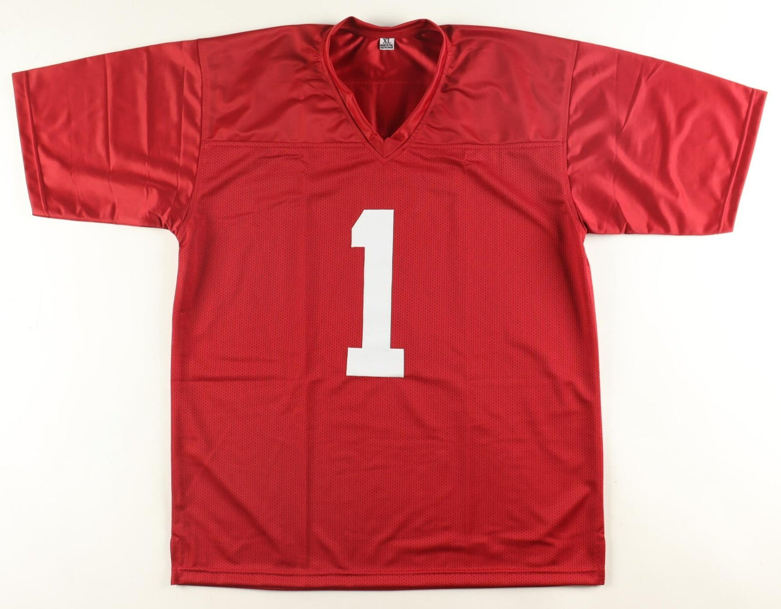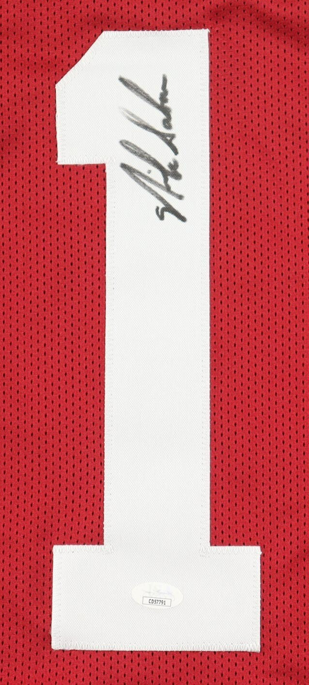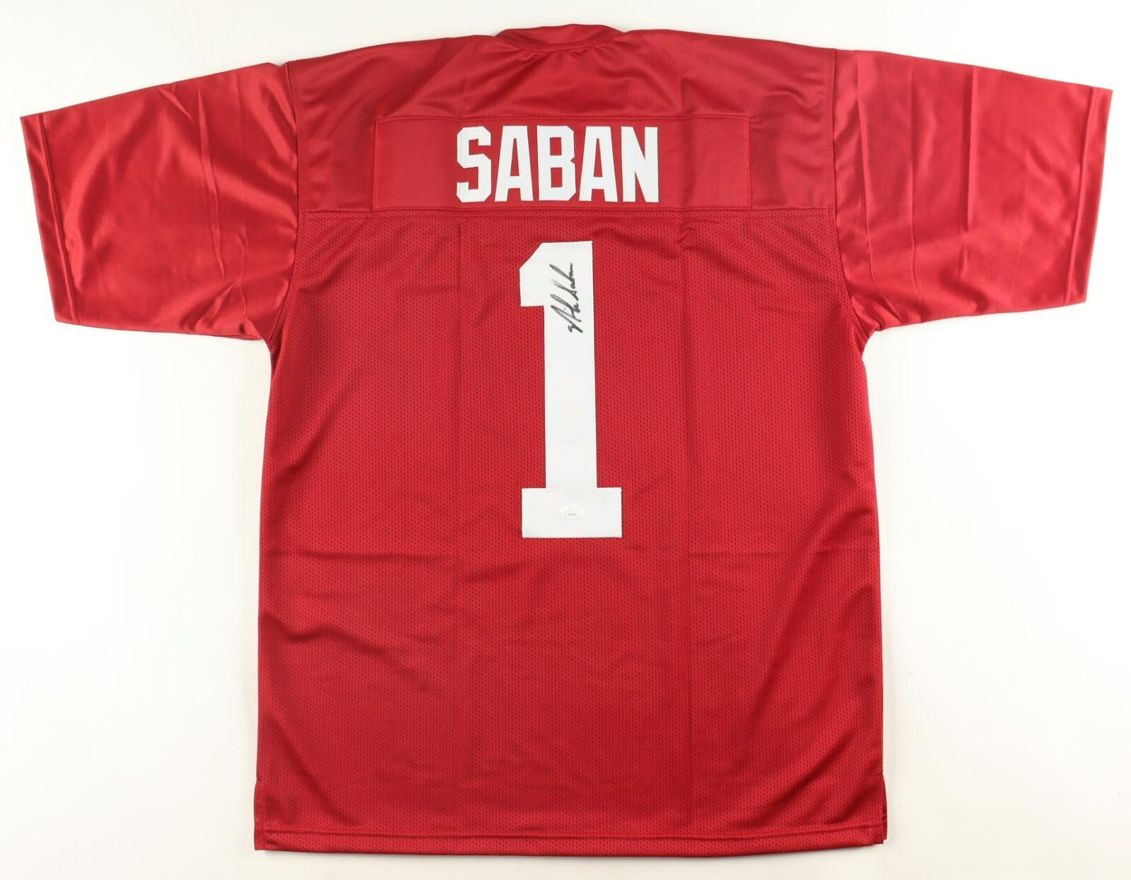 Custom on-field style jersey with everything sewn on, size XL. Hand-signed by Nick Saban.