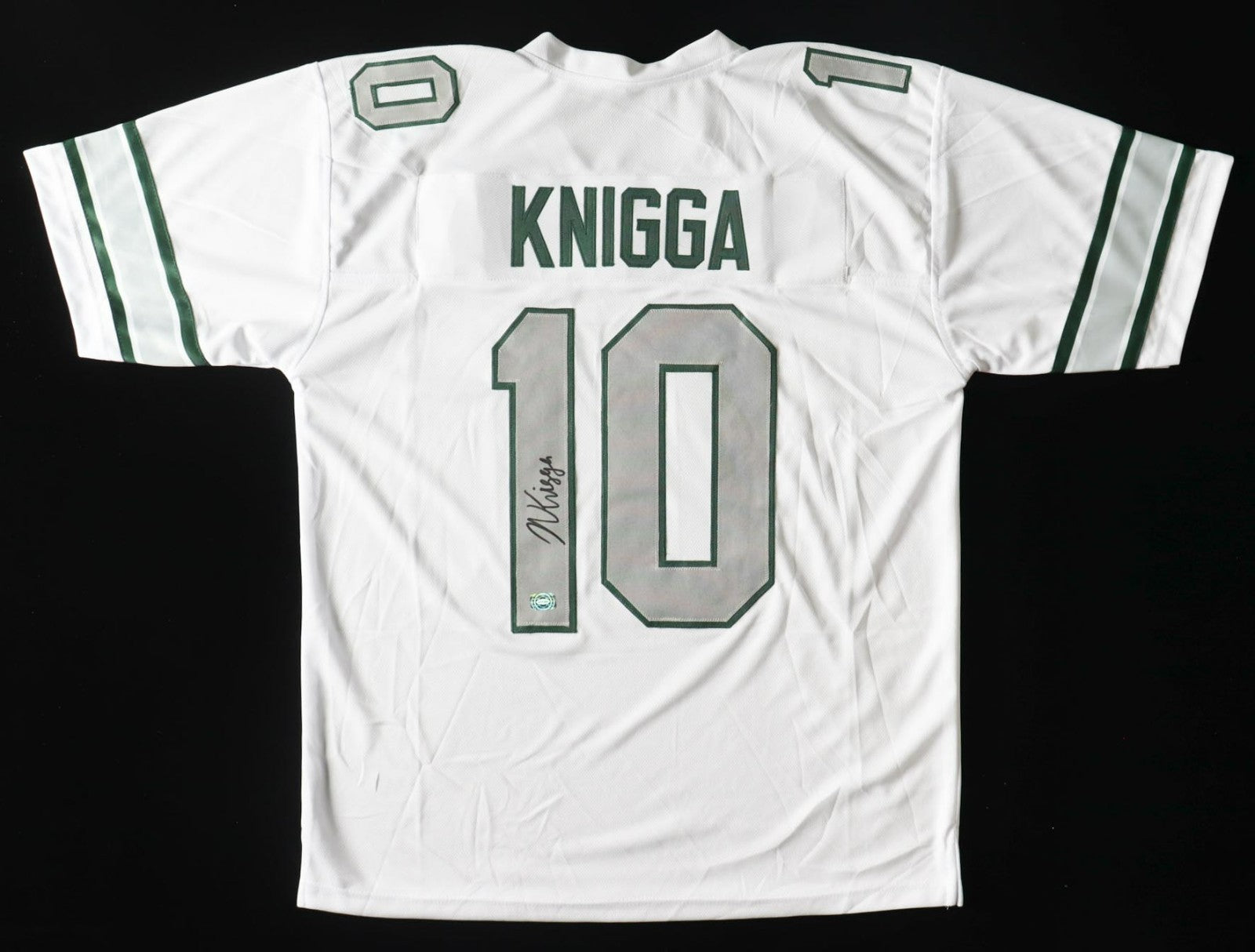 Custom on-field style jersey with everything sewn on, size XL. Jersey has been hand-signed by Noah Knigga. Knigga and his family clarified their surname is pronounced kuh-nay-ga.