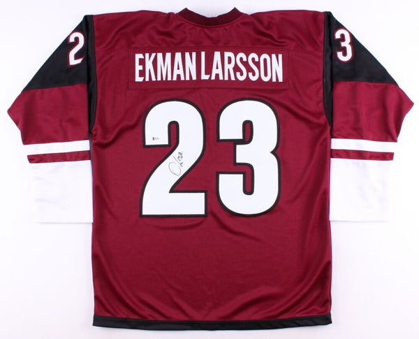Custom on-ice style jersey. Everything is sewn on, size XL. Hand-signed in black felt-tip pen by Oliver Ekman-Larsson. The autograph includes an official Beckett Authentication Services serially numbered hologram and...