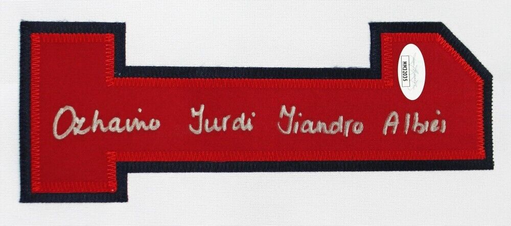 Custom on-field style jersey. Everything is sewn on, size XL. Hand-signed by Ozzie Albies.
