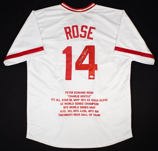 Pete Rose Signed Cincinnati Reds Career Highlight Stat White Jersey (JSA COA)