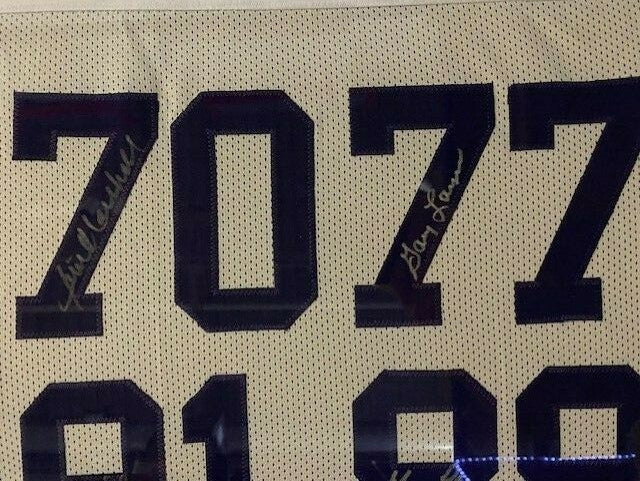 Custom frame measures approximately 35" x 43" in size and features a jersey which has been hand-signed in silver paint pen by "The Purple People Eaters" Alan Page (HOF), Carl Eller HOF), Jim Marshall. & Gary Larsen.