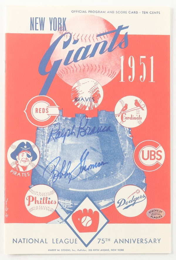 Replica scorecard has been hand-signed by Ralph Branca (D. 2016, Brooklyn Dodgers) and Bobby Thomson (D. 2010, New York Giants).On October 3, 1951, third baseman Bobby Thomson hits a one-out,...