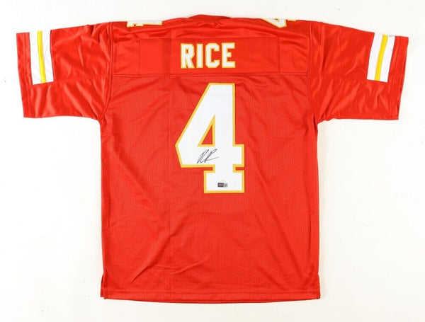 Custom on-field style jersey. Everything sewn on, size Adult XL. Hand-signed by Rashee Rice. The autograph includes an official James Spence Authentication (JSA) hologram and QR Code card as well...