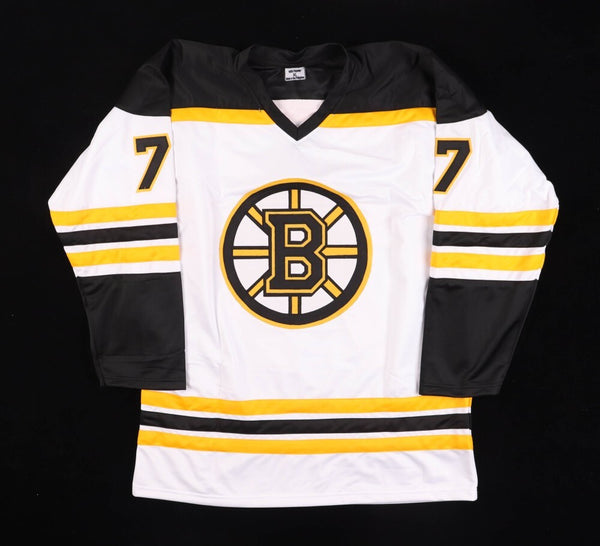 Custom on-ice style jersey. Everything sewn on, size XL. Hand-signed in silver paint pen by Ray Bourque (HOF). The autograph includes an official James Spence Authentication (JSA) hologram and matching...