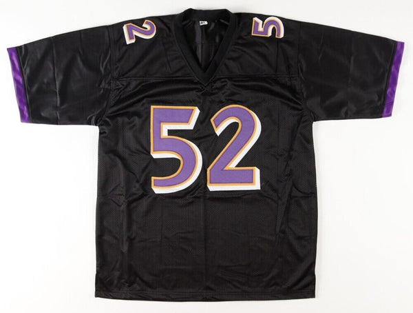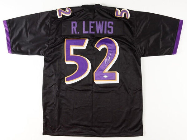 Custom on-field style jersey. Everything sewn on, size XL. Hand-signed in black felt-tip pen by Ray Lewis. The autograph includes an official James Spence Authentication (JSA) hologram and QR Code...