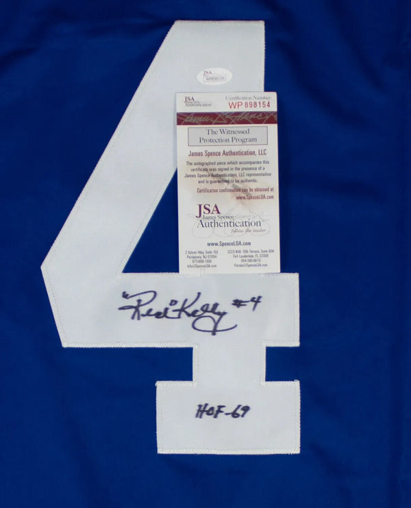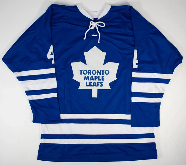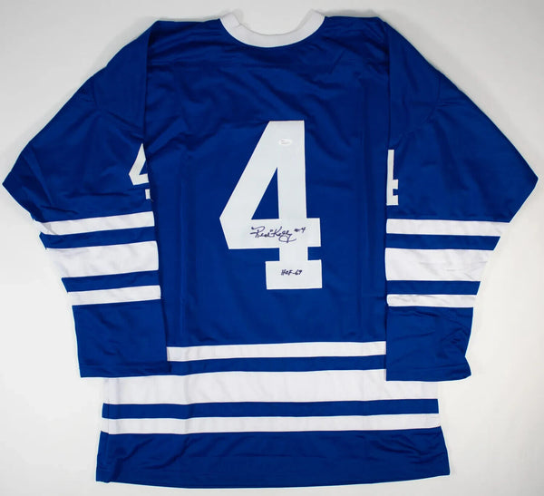 This autographed custom on-ice style adult XL jersey has been personally hand-signed by Red Kelly of the Toronto Maple Leafs. When signing, Kelly inscribed “HOF 69” along with his signature....