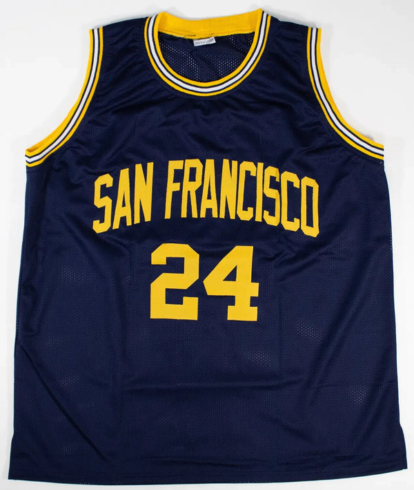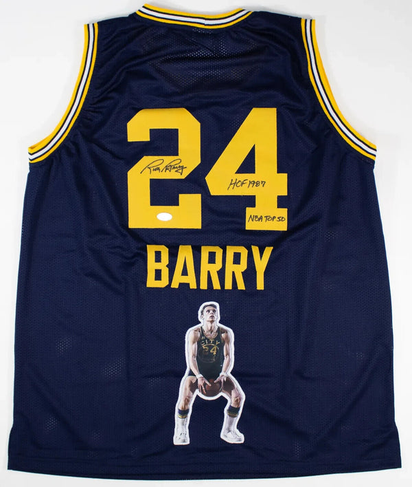 This autographed custom on court style adult XL jersey has been personally hand-signed by Rick Barry of the Golden State Warriors. Barry added the inscriptions "NBA Top 50" and "HOF...