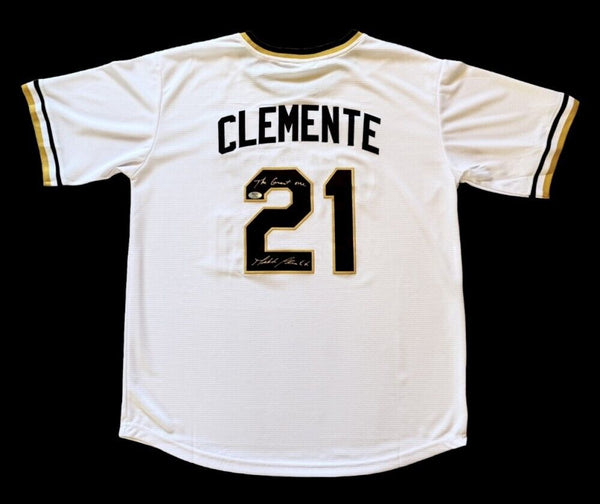 Custom on-field style style jersey with everything sewn on, size adult XL. Hand-signed and inscribed by Roberto Clemente Jr (The son of Pirates Superstar Roberto Clemente Sr.).The inscription that was...