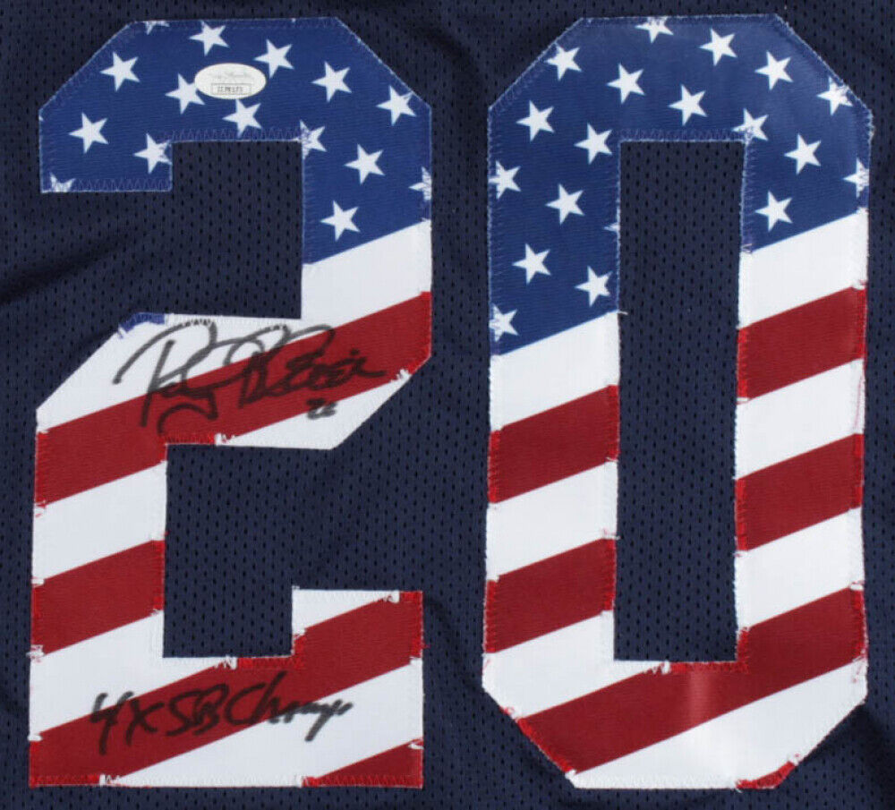 Custom on-field style jersey. Everything is sewn on, size XL. Has been hand-signed and inscribed by Rocky Bleier.