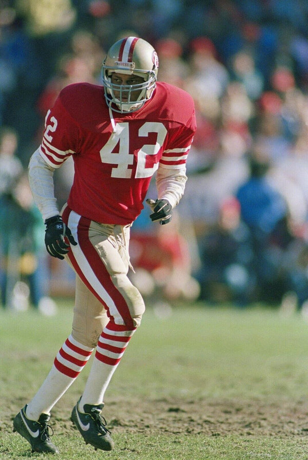 Custom on-field style jersey with everything sewn on., size XL. Hand-signed by Ronnie Lott. Please note, there is a stray ink mark above the hologram. The autograph includes an official...