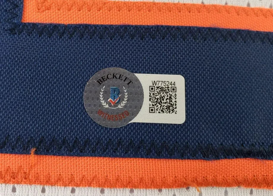 This autograph is certified by Beckett Authentication Services (BAS) Witness Certification. That means that a Beckett representative was present when this item was signed. It comes with the numbered authentication hologram with a QR code that verifies the authentication on the Beckett website.