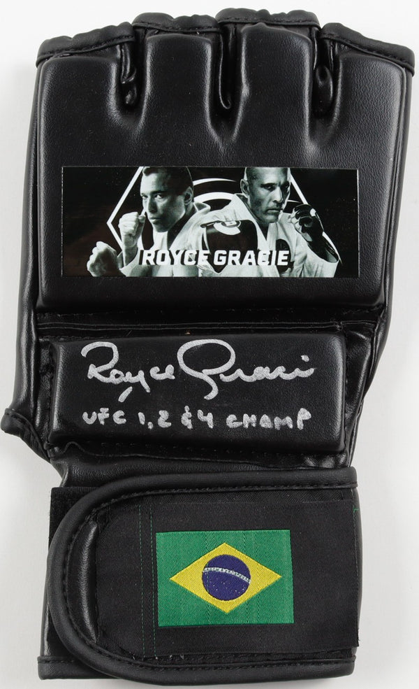 UFC glove is hand-signed and inscribed by MMA legend, Royce Gracie.Royce Gracie is considered by UFC fans to be the most influential figure in the history of modern MMA. Gracie...