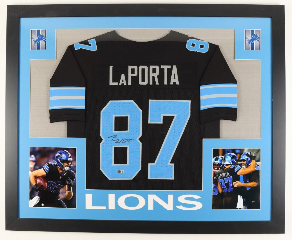 Sam Laporta Signed 35x43 Framed Detroit Lions Jersey (Beckett) 2023 2nd Round Pk