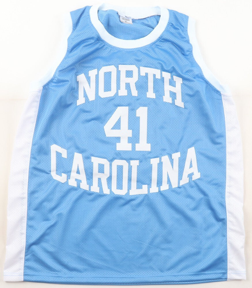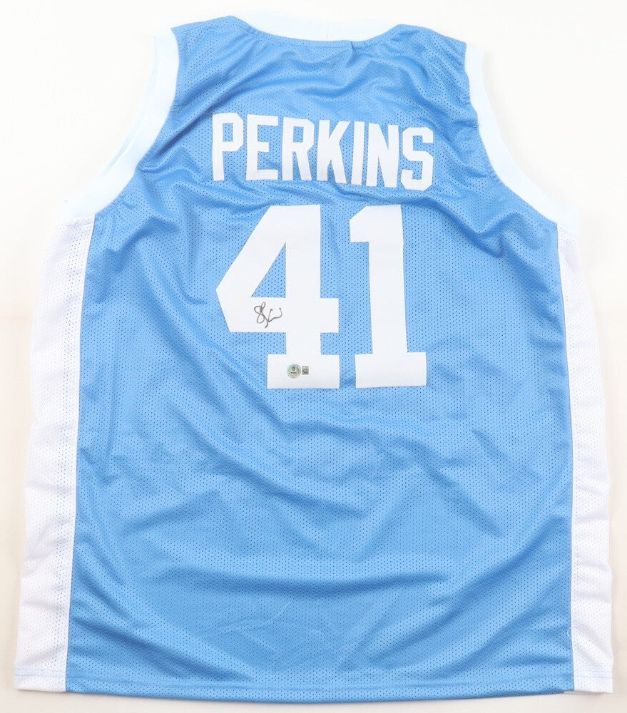 Custom on-court style jersey. Everything sewn on, size XL. Hand-signed by Sam Perkins (North Carolina Tar Heels).