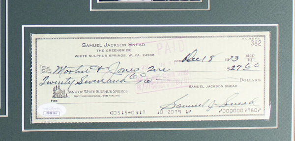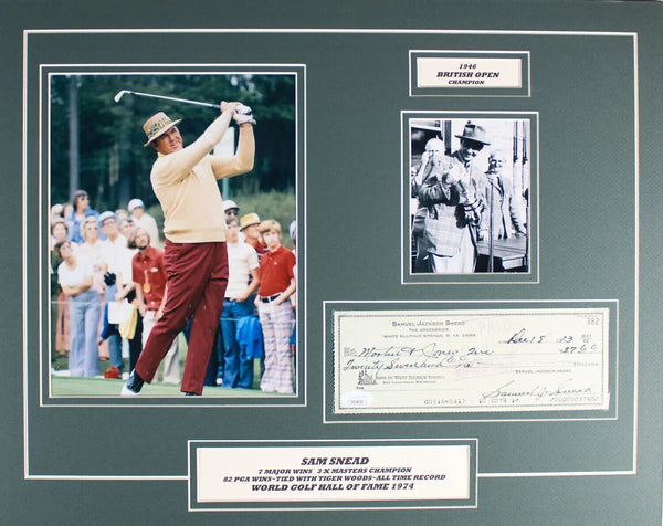 This autographed check in a 16×20 matted display it's ready for framing and has been personally hand-signed by Sam Snead. This autograph is certified by James Spence Authentication (JSA). It comes...