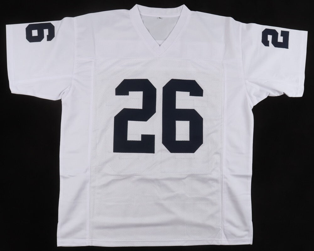 Custom on-field style jersey. Everything sewn on, size XL. Hand-signed by Saquon Barkley.