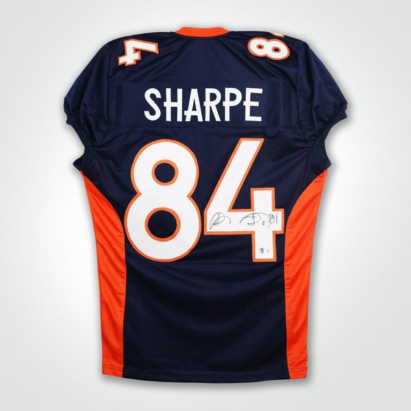 Custom on-field style jersey. Everything is sewn on, size XL. Has been hand-signed Shannon Sharpe. The autograph includes an official Beckett Authentication Services serially-numbered scannable hologram and QR Code card...
