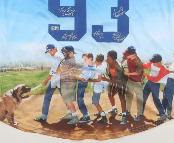 Custom on-field style cast photo jersey. Everything is sewn on, size XL. Has been hand-signed and inscribed by (7) including Tom Guiry (Scotty Smalls), Chauncey Leopardi (Michael 'Squints' Palledorous), Marty York (Alan "Yeah-Yeah" McClennan), Shane Obedzinski (Tommy 'Repeat' Timmons), Victor DiMattia (Timmy Timmons), Grant Gelt (Bertram Grover Weeks) and Brandon Adams (Kenny DeNunez).