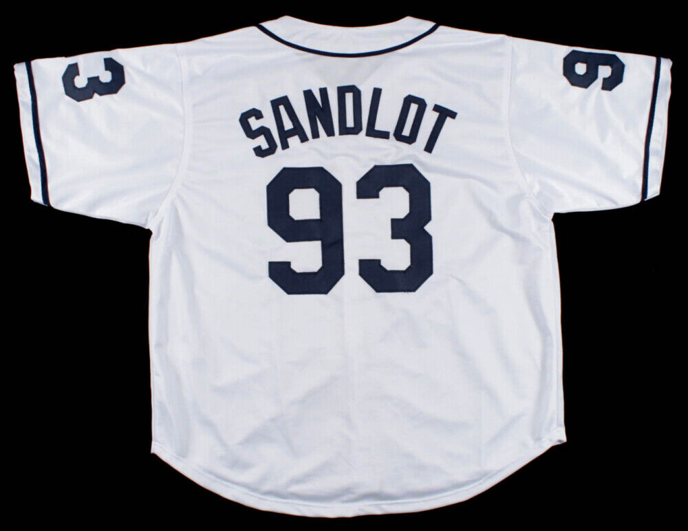 Custom on-field style jersey. Everything is sewn on, size XL. Has been hand-signed and inscribed by (6) including Tom Guiry (Scotty Smalls), Chauncey Leopardi (Michael 'Squints' Palledorous), Marty York (Alan "Yeah-Yeah" McClennan), Shane Obedzinski (Tommy 'Repeat' Timmons), Victor DiMattia (Timmy Timmons), and Brandon Adams (Kenny DeNunez).