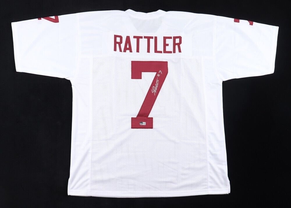 Custom on-field style jersey. Everything is sewn on, size XL. Hand-signed by Spencer Rattler.