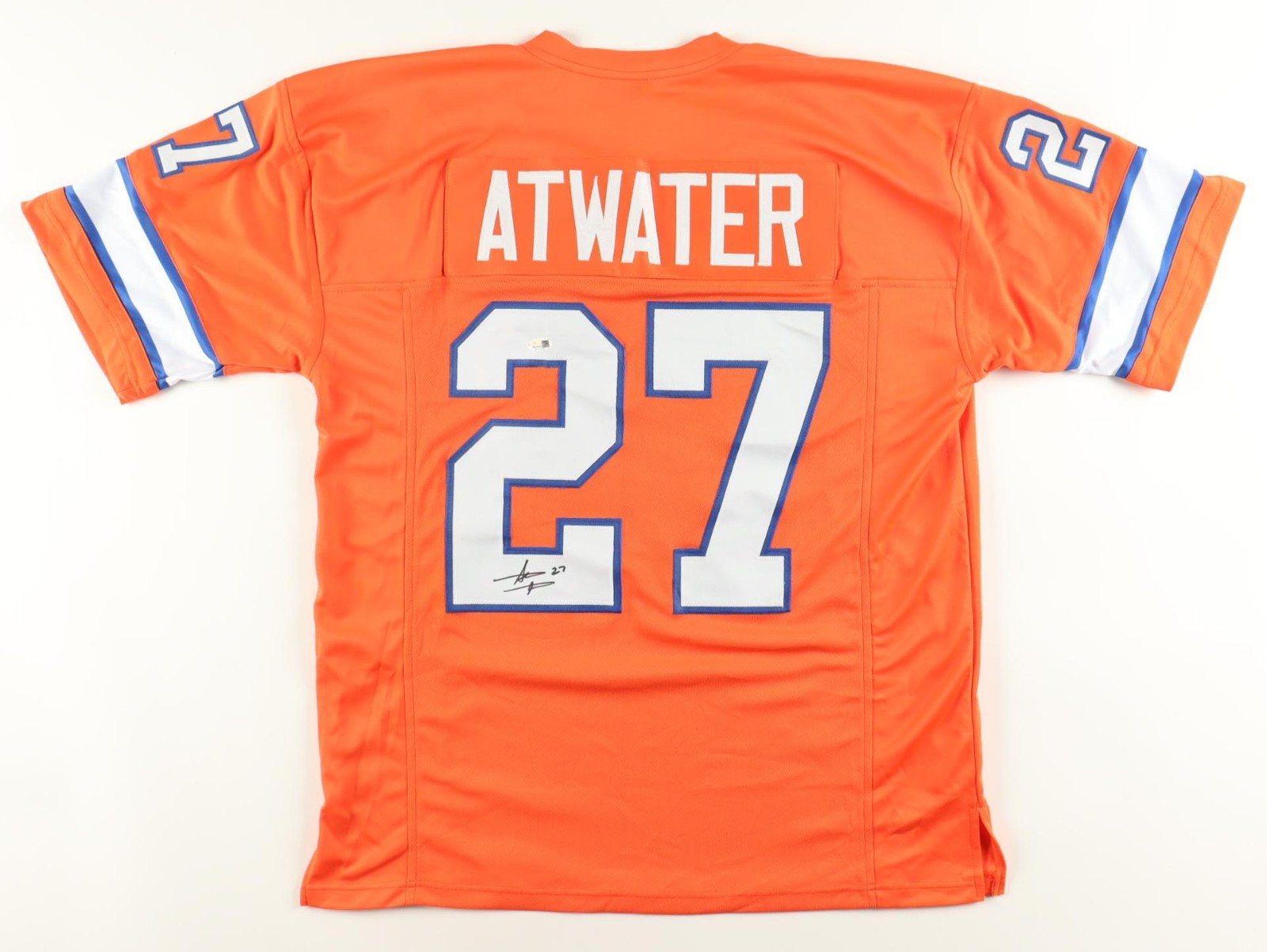 Custom on-field style jersey. Everything is sewn on, size XL. Hand-signed in black felt-tip by Steve Atwater (HOF).