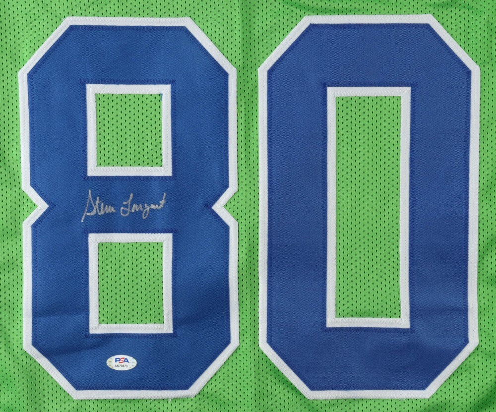 Custom on-field style jersey. Everything is sewn on, size XL. Hand-signed by Steve Largent (HOF).