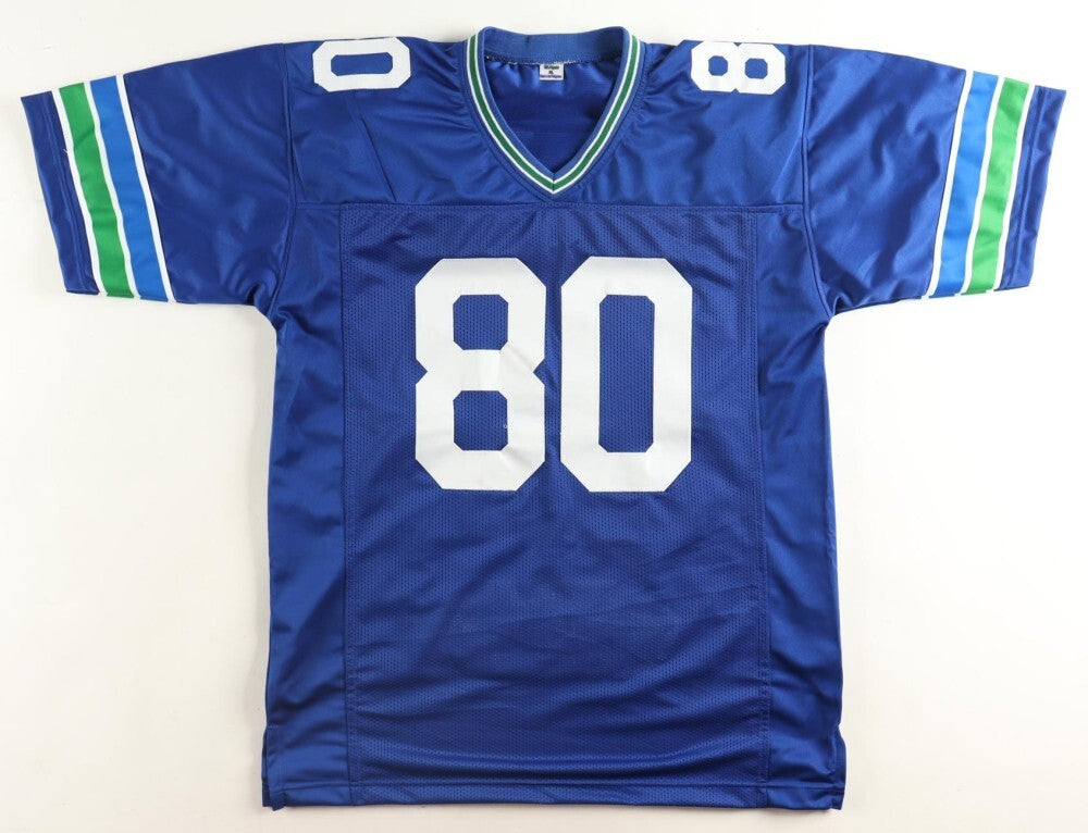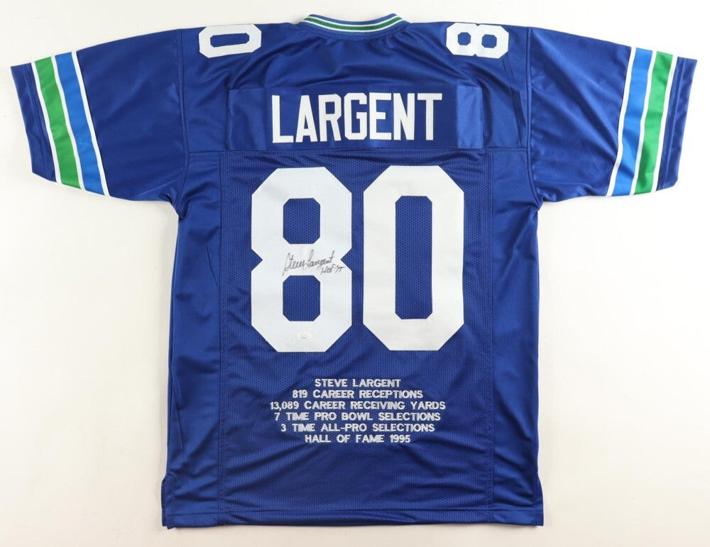Please note, the Career Receiving Touchdowns on the jersey is incorrect. Largent had 13,089 receiving yards and scored 101 touchdowns.