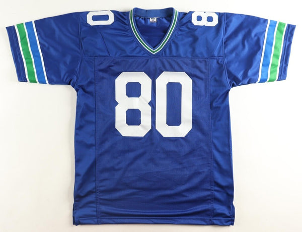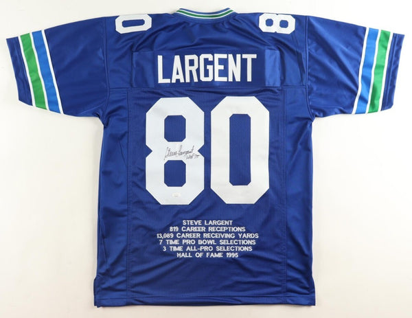 Custom on-field style jersey. Everything is sewn on, size XL. Has been hand-signed and inscribed in black felt-tip pen by Steve Largent (HOF). Please note, the Career Receiving Touchdowns on...