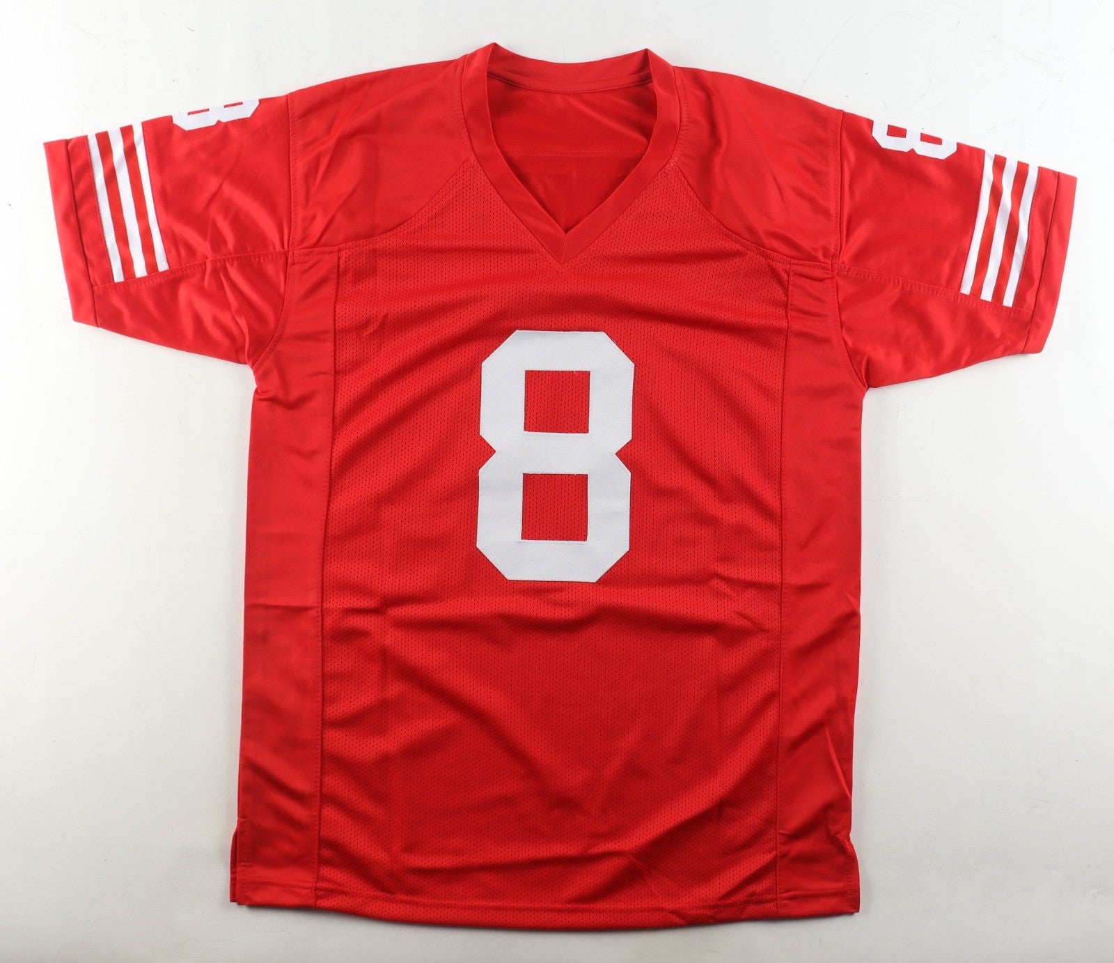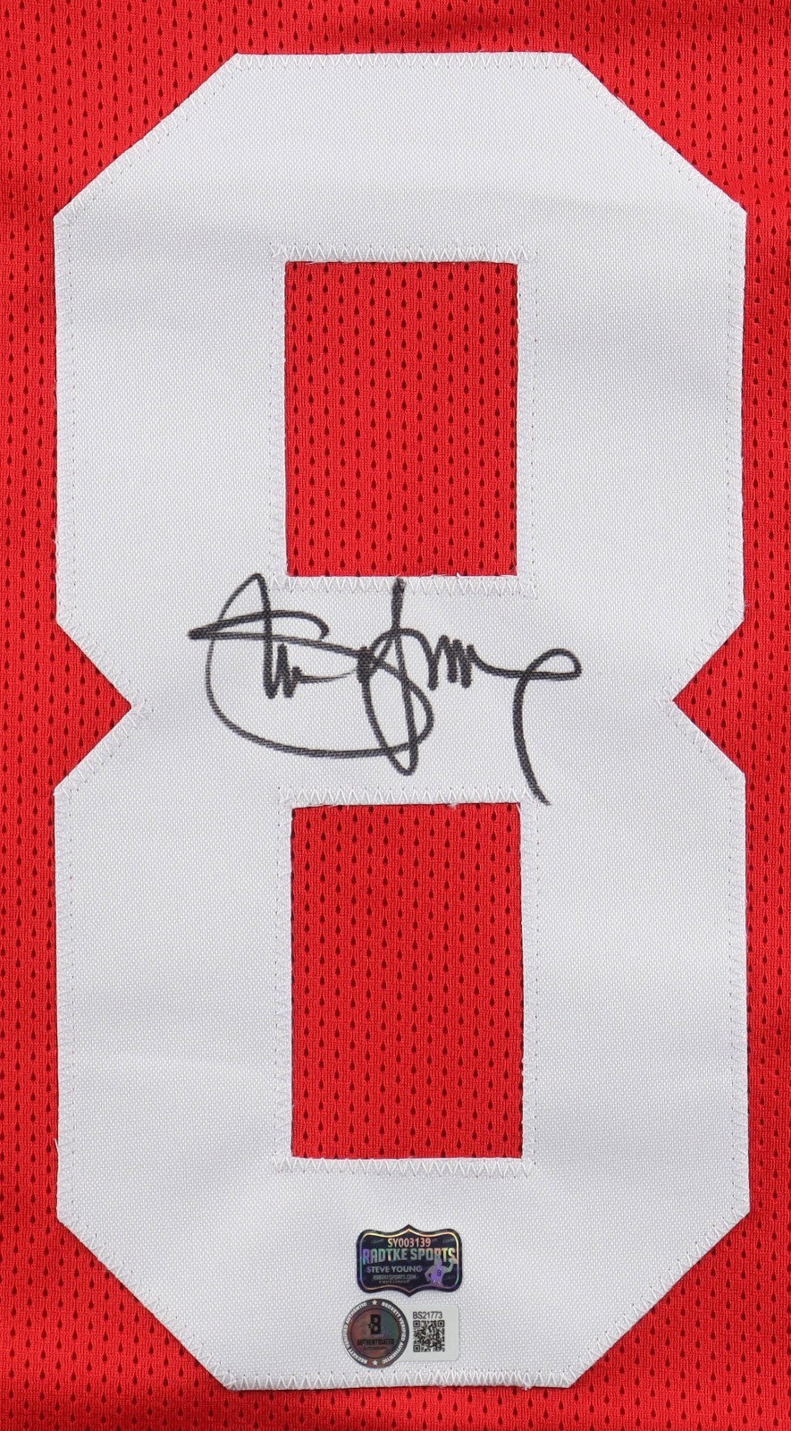 Custom on-field style jersey. Everything sewn on, size XL. Hand-signed by Steve Young.
