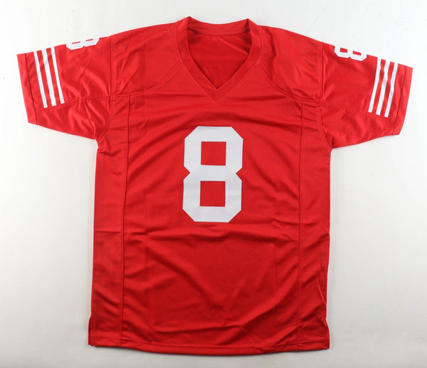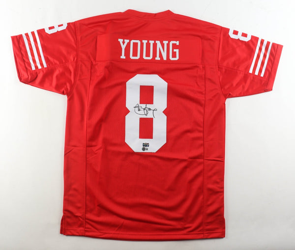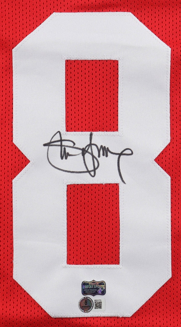 Custom on-field style jersey. Everything sewn on, size XL. Hand-signed by Steve Young. The autograph includes an official Beckett Authentication Services serially numbered hologram and QR Code Card for authenticity...