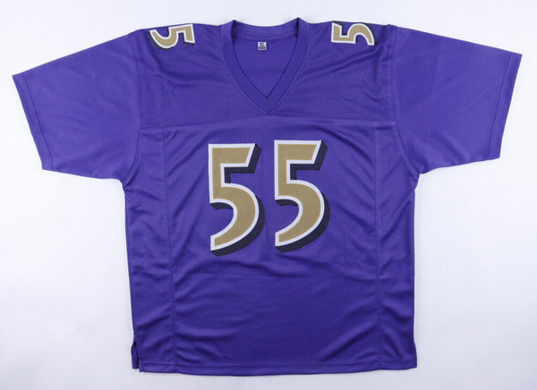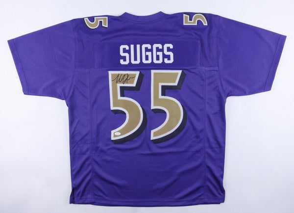 Custom on-field style jersey. Everything is sewn on, size XL. Hand-signed in silver paint pen by Terrell Suggs. The lot / autograph(s) includes an official James Spence Authentication (JSA) hologram...