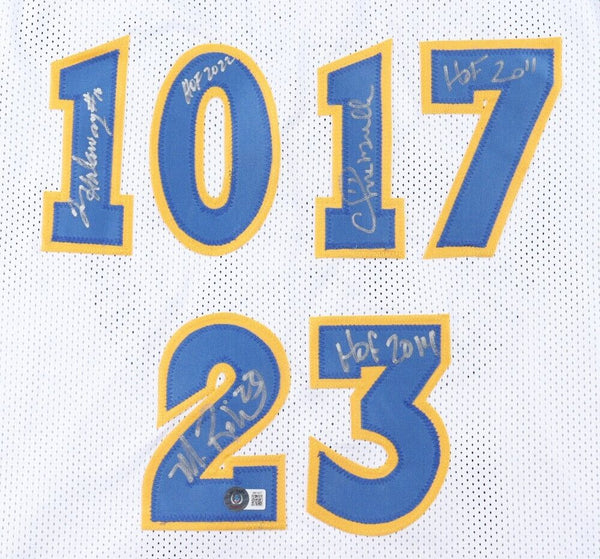Custom on-court style jersey. Everything is sewn on, size XL. Hand-signed and inscribed by Tim Hardaway (HOF), Mitch Richmond (HOF), & Chris Mullin (HOF). The autograph includes an official Beckett...