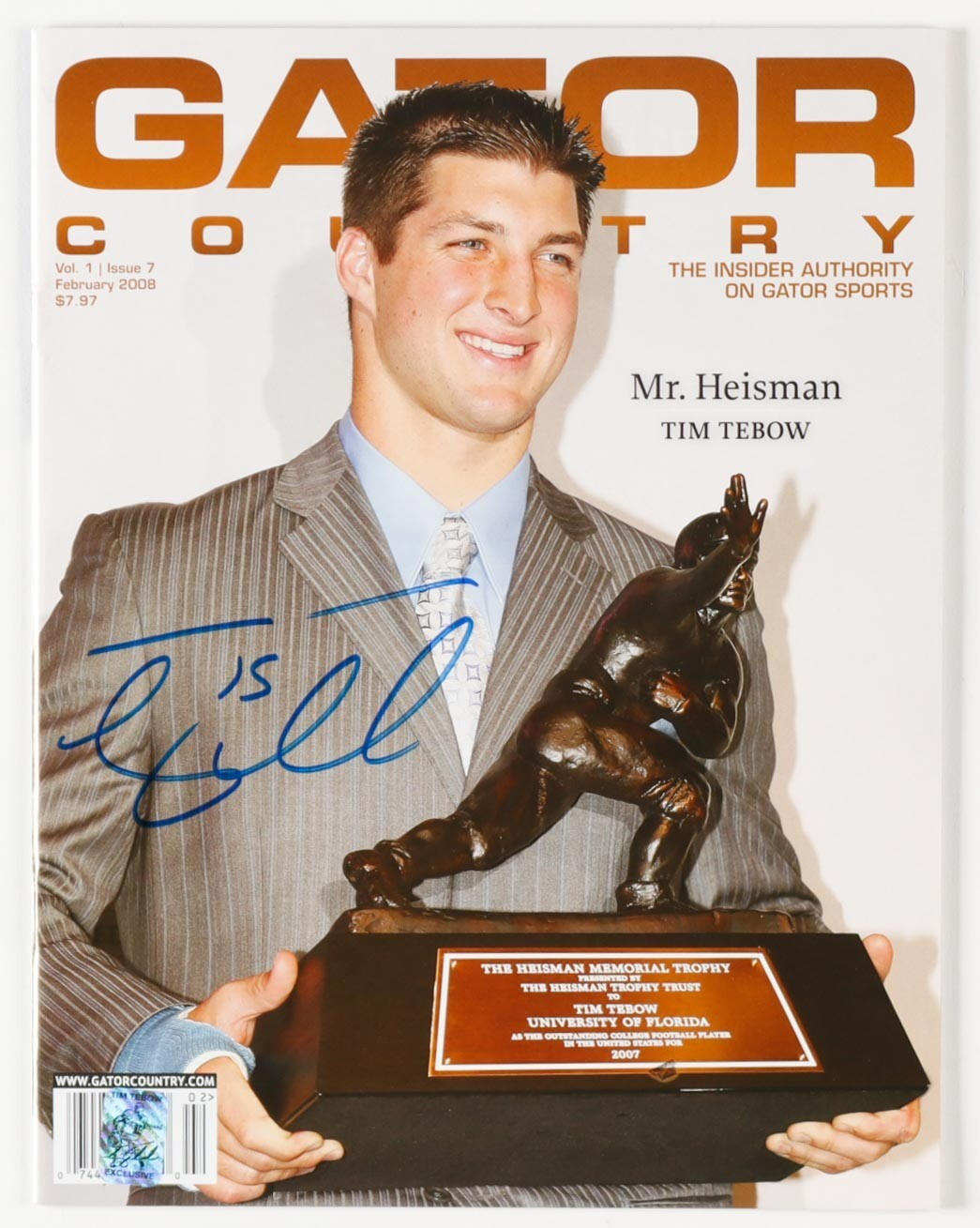 February 2008 Gator Country Magazine has been hand-signed on the cover by Tim Tebow (Denver Broncos).