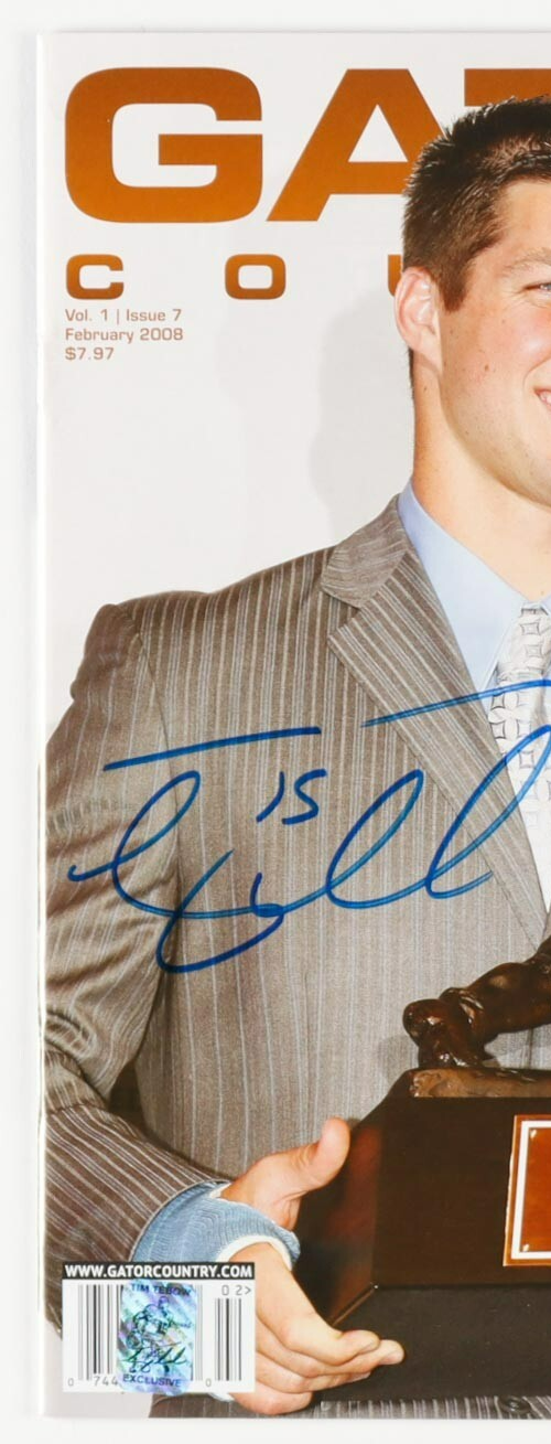 February 2008 Gator Country Magazine has been hand-signed on the cover by Tim Tebow (Denver Broncos).The lot / autograph(s) includes an exclusive official Tim Tebow hologram for authenticity purposes.Authentication: Tebow...
