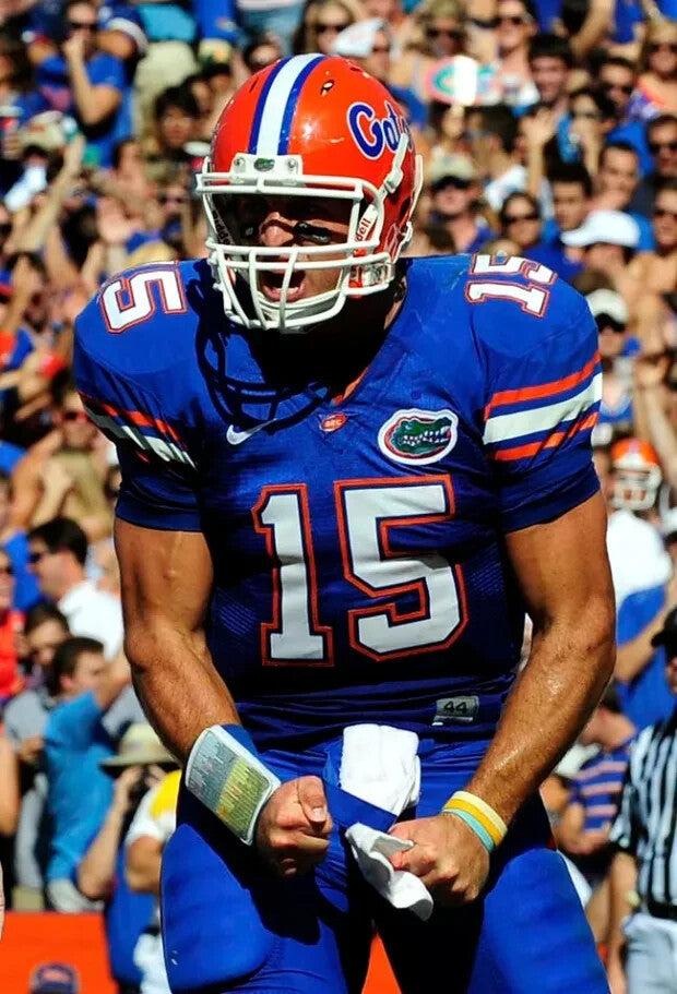 Custom on-field style jersey. Everything is sewn on, size Adult XL. Hand-signed by Tim Tebow.