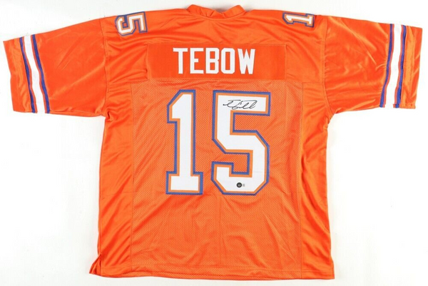 Custom on-field style jersey. Everything is sewn on, size Adult XL. Hand-signed by Tim Tebow. The autograph includes an official Beckett Authentication Services serially numbered scannable hologram and QR Code...