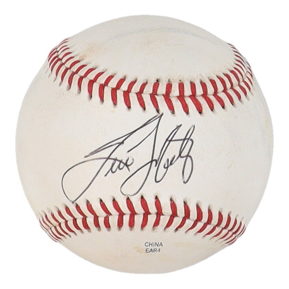 Rawlings Official Minor League baseball. Hand-signed by Tino Martinez (Seattle Mariners, New York Yankees, St. Louis Cardinals, Tampa Bay Rays). Please note, the ball is naturally toned and has staining throughout.