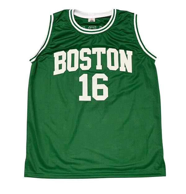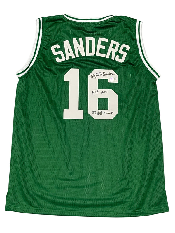 This autographed custom on-court style adult XL jersey has been personally hand-signed by Tom "Satch" Sanders of the Boston Celtics. When signing, Sanders also inscribed “HOF 2011” and “8x NBA...