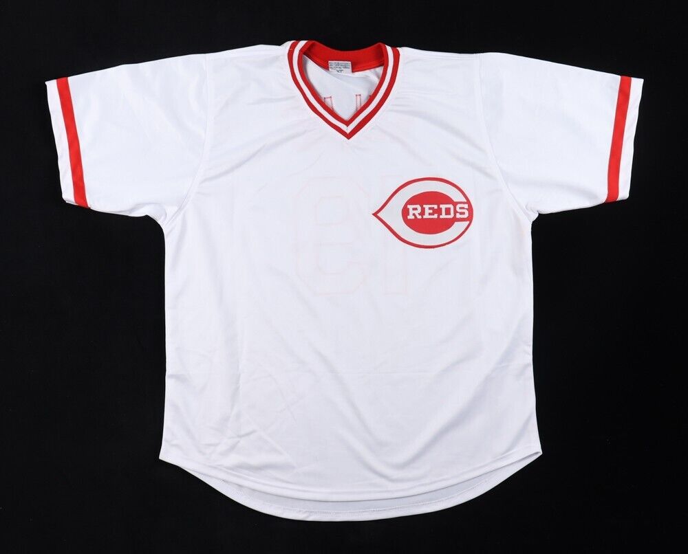 Custom on-field style jersey. Everything is sewn on, size XL. Hand-signed and inscribed by Tommy Helms.