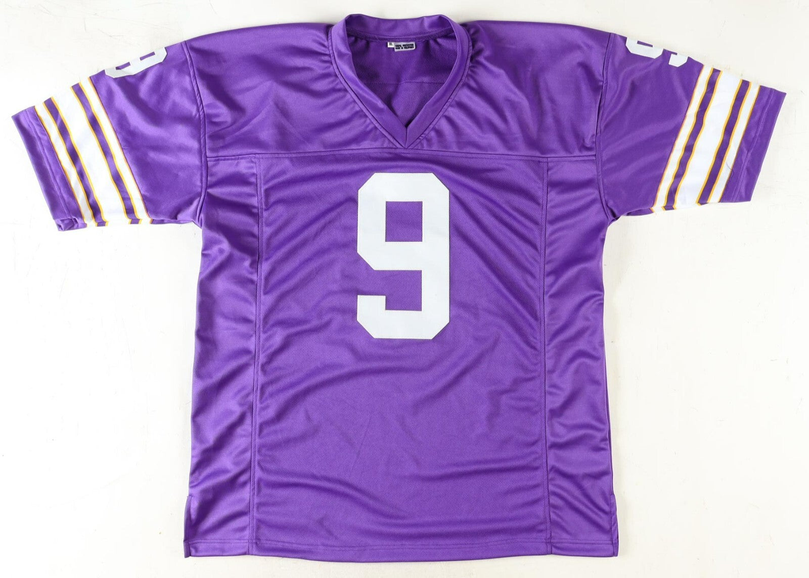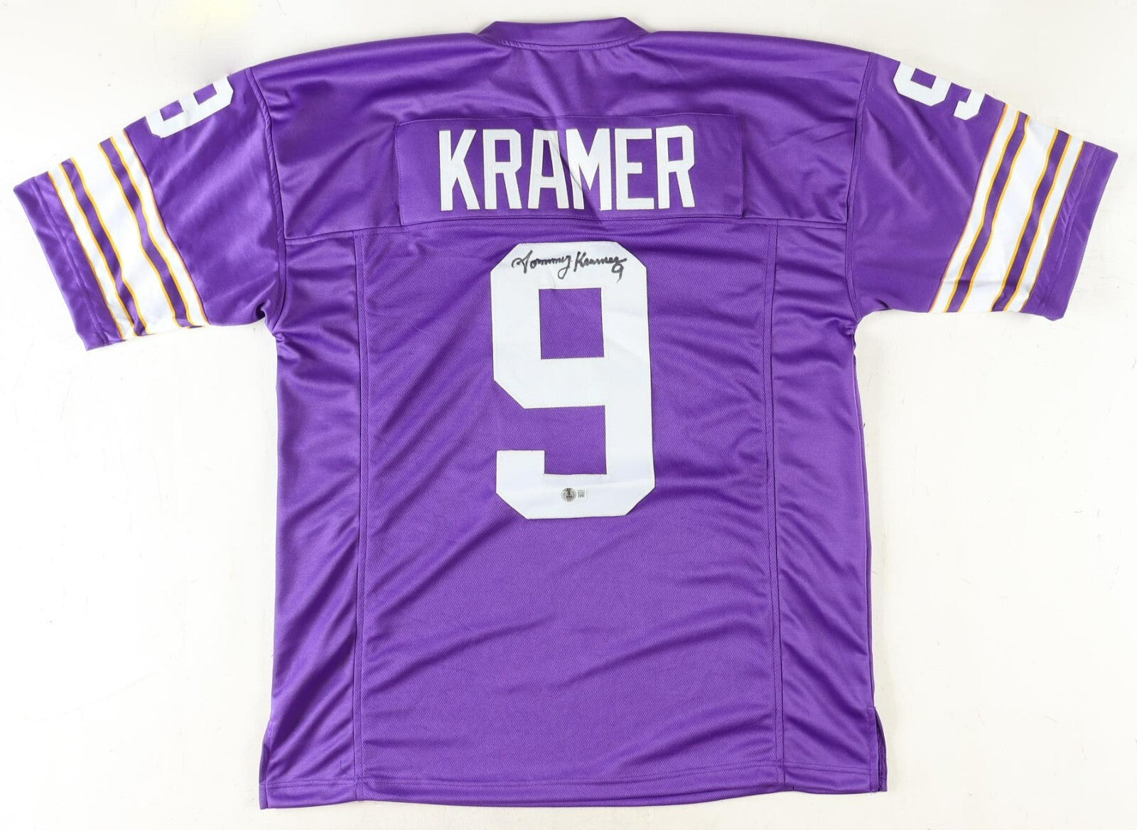 Custom on-field style jersey. Everything sewn on, size XL. Hand-signed by Tommy Kramer.