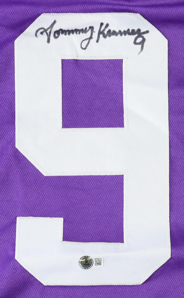 Custom on-field style jersey. Everything sewn on, size XL. Hand-signed by Tommy Kramer. The autograph includes an official Beckett Authentication Services serially numbered hologram and QR Code Card for authenticity...