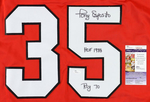 Custom jersey. Everything is sewn on, size XL. Hand-signed and inscribed by Tony Esposito (D. 2021, HOF). The autograph(s) includes an official James Spence Authentication (JSA) hologram for authenticity purposes.Authentication:...