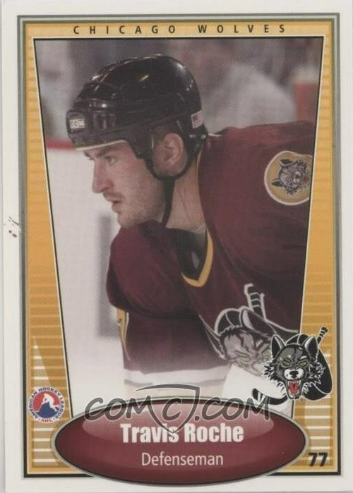 Authentic SP AHL jersey with everything sewn on, size 54. Hand-signed by Travis Roche (Chicago Wolves).