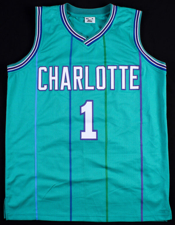 Custom on court style jersey with everything sewn on, size XL. Jersey has been hand-signed in black paint pen by Muggsy Bogues. The autograph includes an official James Spence Authentication...