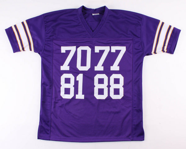 Custom on-field style jersey. Everything is sewn on, size XL. Jersey has been hand-signed in black felt-tip pen by Alan Page (HOF), Carl Eller (HOF), Jim Marshall and Gary Larsen....